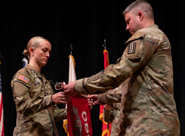 During the ceremony, Capt. Catherine Bean and 1st Sgt. Bryan Estes, the 180th ESC command team, furled their organizational colors to signify the start of the mobilization. They will unfurl the colors when they arrive in the Hom of Africa and officially take responsibility for their mission.
